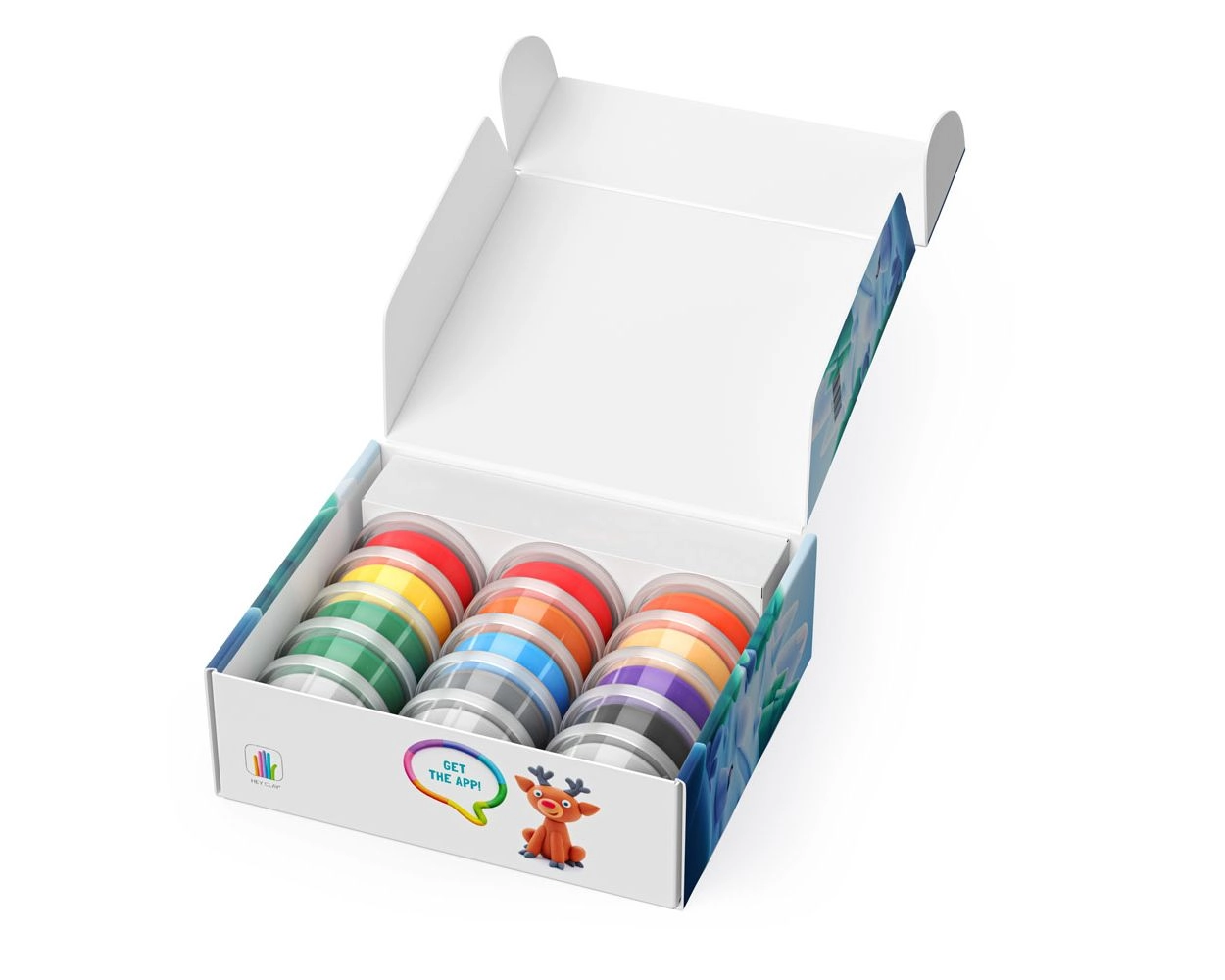 Kleurrijke kleisets met een bijbehorende app voor interactieve knutselplezier.