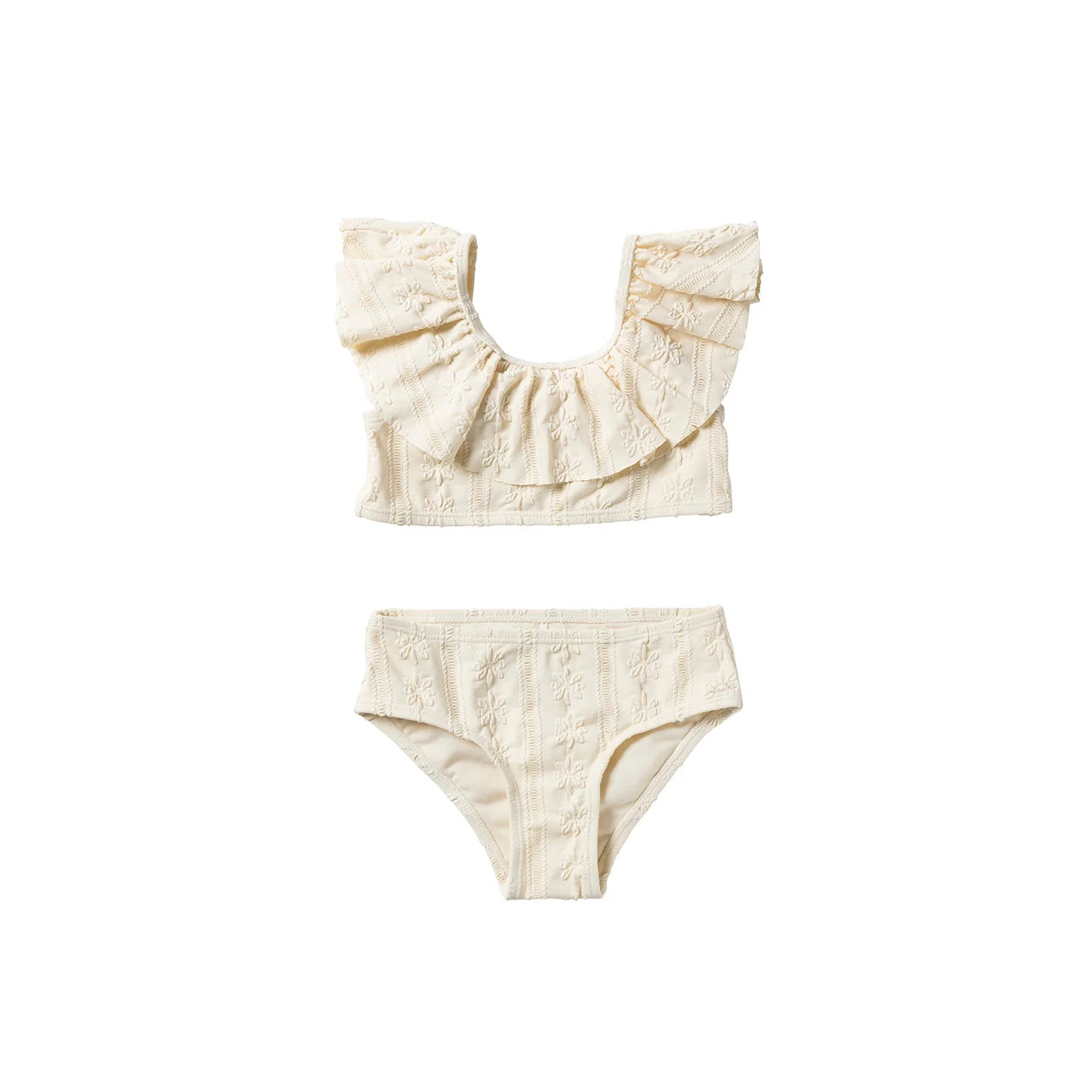 De Anglaise Bikini set van Salted Stories voor meisjes is de perfecte keuze voor een stijlvolle en beschermde zomer. Deze bikini biedt UPF 50+ bescherming, die tot 98% van schadelijke UV-stralen blokkeert, zodat je kindje zonder zorgen kan genieten van het zwembad of het strand. Het topje heeft schattige ruffle schouderbandjes, terwijl het broekje een hoog model heeft voor extra comfort. Beide delen zijn volledig gevoerd voor een fijne en goede pasvorm. De Anglaise broderie geeft de bikini een elegante uitstraling in een subtiele witte kleur, perfect voor jonge modebewuste meisjes.