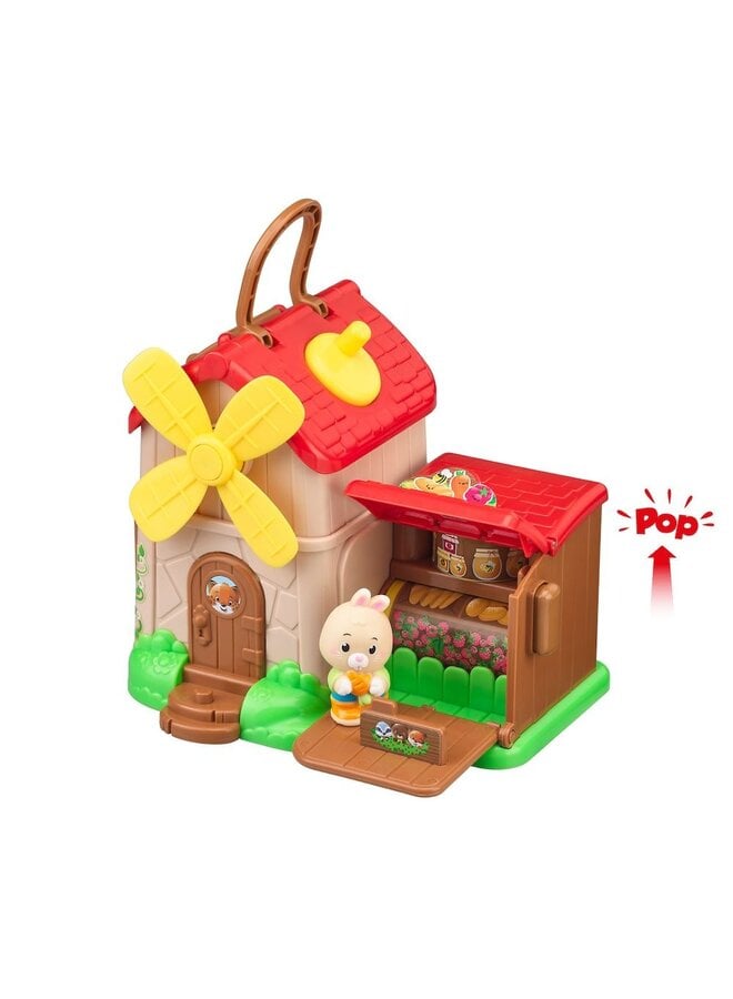 Daarnaast is er een grote tuin vol verrassingen die je kunt openen: "POP"! groenten die verschijnen door op de knoppen te drukken, een bij die ronddraait om bloemen of vruchten te onthullen afhankelijk van het seizoen, een bijenkorf die opengaat om de honing te laten zien, een grappige draaischijf die je kunt activeren om afbeeldingen te laten wisselen… en soms verschijnt er zelfs een figuurtje!