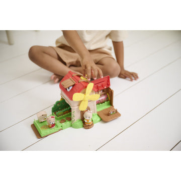In het midden staat een grote molen met een zwengel om de wieken op het dak te laten draaien. Ontdek ook een geheime verstopplek om een figuurtje in te verbergen.