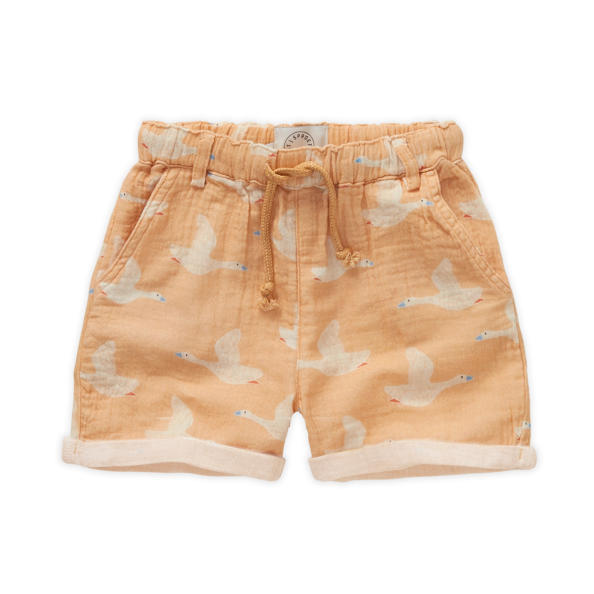 Deze geweven mousseline shorts van Sprout & Sprout maakt je zomer een stuk vrolijker. Gemaakt van 100% katoen en een heerlijke nectarine kleur met een all-over ganzenprint. De verstelbare tailleband met trekkoord zorgt voor een perfecte pasvorm, waardoor ze zowel speels als praktisch zijn voor zonnige avonturen.