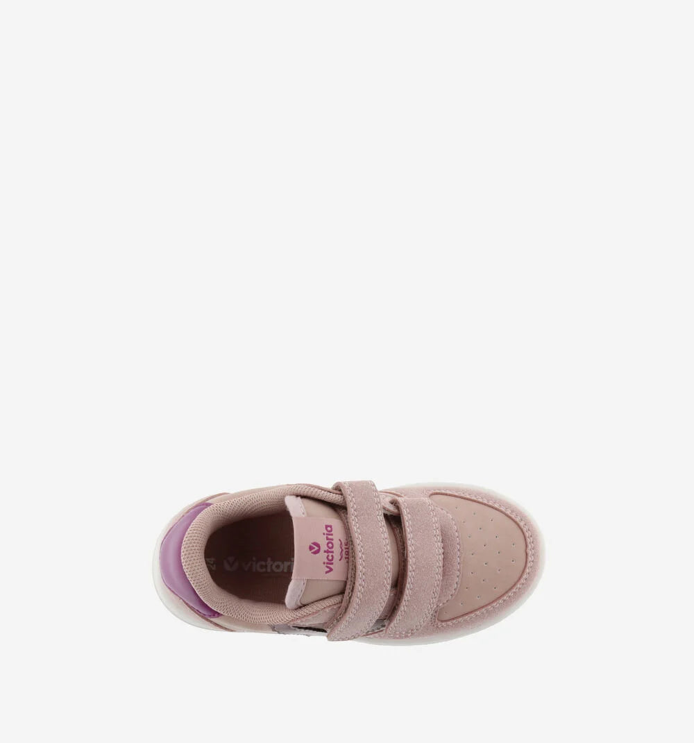 Deze sportieve Tiempo straps sneakers van Victoria gemaakt van Nude imitatieleer met ton-sur-ton suède overlays. Op de zijkanten de Retro V van Victoria, en aan de achterkant bij de hiel is voorzien van een ander kleurdetail, dat maakt het tot een speelse schoen.