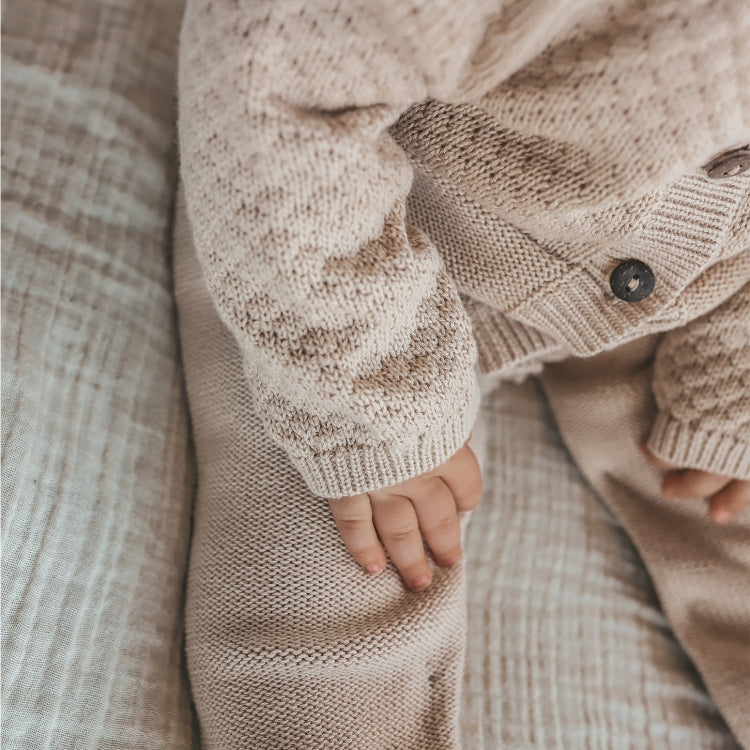 Deze Bubble Knit Onesie van het merk Your Wishes is gebreid en speciaal gemaakt voor newborn baby's. De onesie heeft een beige kleur met een aparte bubble steek. Langs de benen loopt een blinde drukknoopsluiting waardoor het verschonen gemakkelijker wordt. Aan de voorkant zitten kleine houtenknoopjes, voor een mooie en luxe look