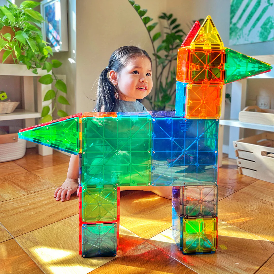 De Magna-Tiles 100-delige set is de perfecte basis (of uitbreiding) voor elk kind dat houdt van bouwen, ontdekken en eindeloos creatief spelen. Met maar liefst 100 hoogwaardige magnetische tegels in verschillende vormen en kleuren, kunnen kinderen hun verbeelding de vrije loop laten: van kastelen tot raketten, van huizen tot hele steden.