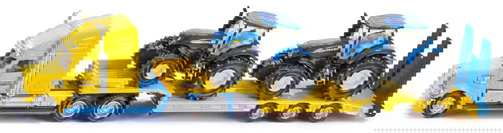 De Siku dieplader met New Holland tractoren brengt het echte boerenleven naar je speelkamer. Dit prachtige schaalmodel combineert realistisch transport met stevige Siku-kwaliteit. De set bestaat uit een krachtige vrachtwagen met oplegger en twee New Holland tractoren, klaar voor elke landbouwklus of boerentransport.